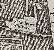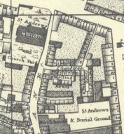 St. Andrew, Holborn. Reduced considerably when Holborn Viaduct and St Andrew St. Constructed. Built on the the south. 2002 saw the clearance of the crypt and removal of human remains to the City of London Cemetery. They should be comfortable there - COLC was named 'cemetery of the year' in 2001. The churchyard was raided by bodysnatchers on the night of the 29th November, 1804. Several graves were opened and the recently buried body of a child was found dumped on the church steps. (The Times, Dec 1st 1804) |