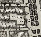 Additional ground for St. Bride’s, Fleet Street. Opened in the time of the plague. Is the present courtyard in Harp Alley, St Brides Street, partly on the site of ground? Excavated post war. This is off Farringdon Street, is about 750 square yards in extent, and used as a volunteer drill-ground. There are no tombstones, and the ground is untidy. Consecrated 1610. Given by the Earl of Dorset. (Holmes) |