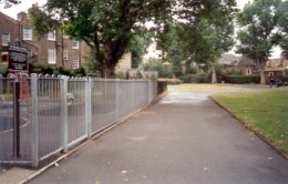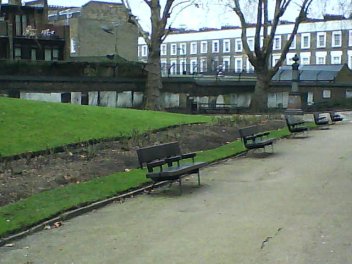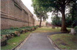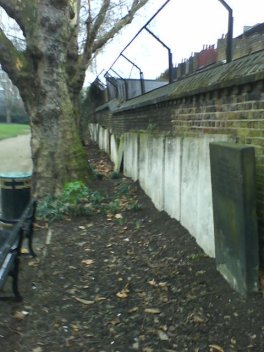 in Pratt Street. Ground purchased by St Martin in the Fields in 1805. In use until 1856, at first for St Martin's parishioners (mainly the poor) then later for other parishes. Now a not especially exciting open space, with gravestones around the edge. To the south these have been arranged in a rather odd herring-bone pattern for no obvious reason. Over 18,000 burials recorded at the site. 1¾ acres. This was consecrated in 1805; It is now a well-kept public garden under the control of the St. Pancras Vestry. A part appears to have been appropriated as a private garden for the almshouses and as a site for a chapel and other buildings. (Holmes) On Saturday morning, about 4 o’clock, a party of resurrection men scaled the walls of St Martin’s burying-ground situated in the fields at the back of Camden-town, for the purpose, as it is supposed, of stealing the body of a grenadier nearly 7 feet high, who had died in the poor-house of that parish, and had been buried in the above mentioned place of interment. The sexton, to guard the ground, had, more ingeniously than lawfully, put together a number of gun-barrels so as to form a magazine, that they might all be discharged together. After burying the bodies of the paupers, he made it a practice to direct the muzzle of this formidable engine towards the mound of earth which was the general receptacle for the dead parochial poor, and having a string fixed to the trigger, he fastened the other end of it round a large piece of wood, which he buried in the grave about a foot below the surface of the ground, so that if anyone should attempt to dig, they must necessarily remove the above piece of wood, the string would pull the trigger, and a volley of bullets would immediately sweep that quarter of the burying ground. On the morning in question, about half past 4, he heard a tremendous report, and concluding it was his new piece of ordnance, he went out as soon as possible, and on arriving at the guarded spot, he found some spades, shovels, pick-axes, and other resurrection paraphernalia. Among other things he found a man’s hat, through one side of which a bullet had evidently passed; but from there being no track on the other side of it, it is concluded that the bullet had lodged in the head of the owner and killed him, and that he had been carried off by his associates. (The Times, Jan 29, 1817) |